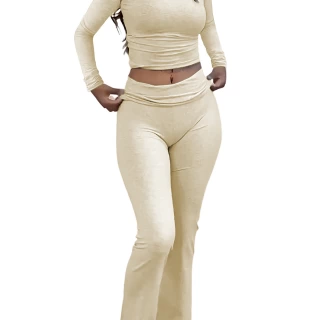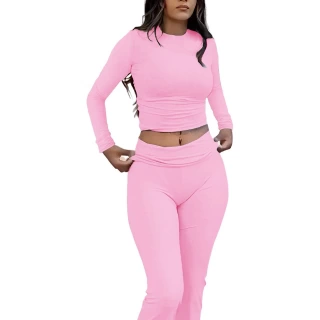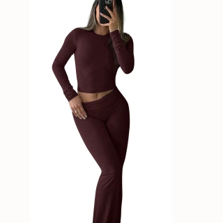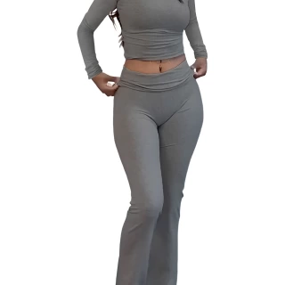 The design is clean and elegant, pairing a cropped crop top with flared pants for a look that blends casual comfort with modern style, perfect for everyday outings, lounging at home, and more. The fabric appears soft and stretchy, hugging the body's curves for a comfortable fit. The cropped top accentuates the waistline, enhancing body proportions; the flared silhouette flatters the legs, creating a sleek and elongated appearance.